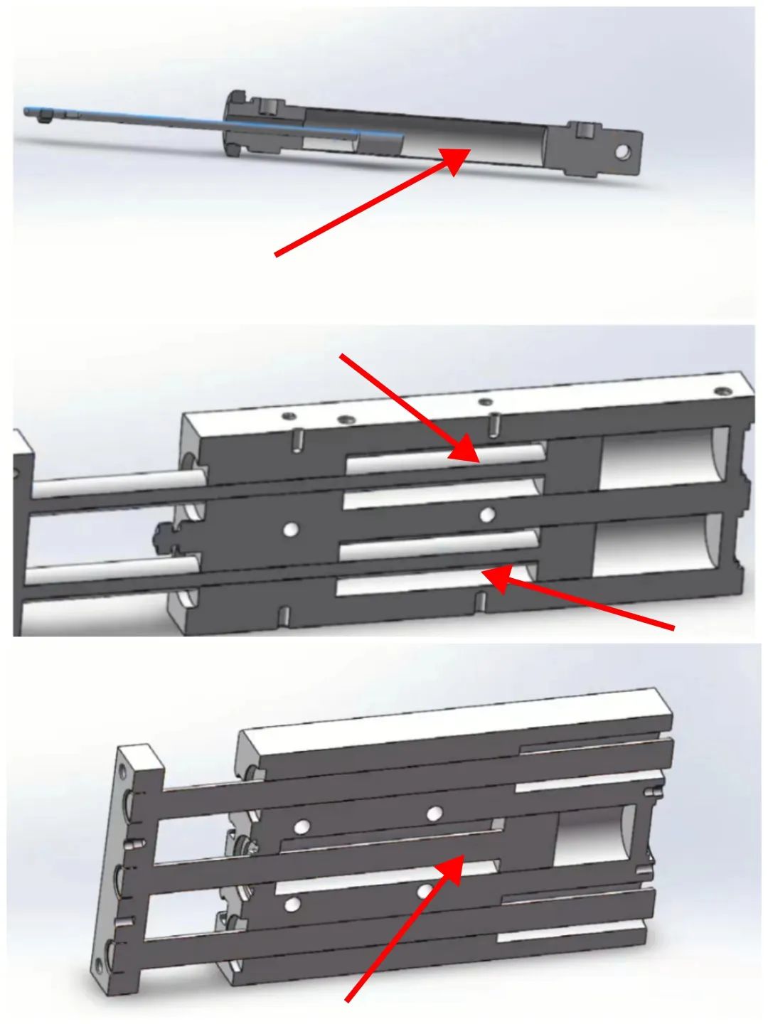 A:不是哦,氣缸推力的大小主要由氣缸內徑大小決定的。氣缸大小同等條件下,因為單軸、三軸都只有一個氣缸,而雙軸呢有兩個氣缸(如圖箭頭標注),所以雙軸氣缸的推力是單軸、三軸氣缸的兩倍,并不是軸越多推力越大哦!